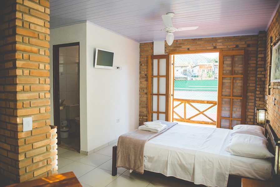 INSTALAÇÕES Aconchegantes e confortáveis, as 20 suítes da Pousada Casarão dispõem de 1 cama de casal e uma bi-cama, ventilador de teto, frigobar e tv. Todas são avarandadas e com o mesmo padrão de qualidade. As suítes Master possuem ar-condicionado, vista privilegiada, frente a piscina e belo jardim.